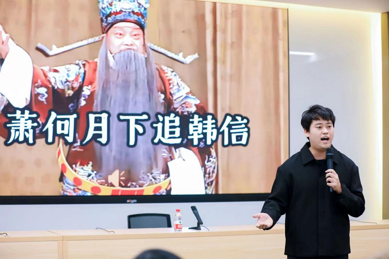 球王会体育官方网站2023级本科生表演了精彩的节目。王英昊同学演唱了京剧选段《萧何月下追韩信》,唱腔高亢嘹亮,赢得了阵阵掌声。