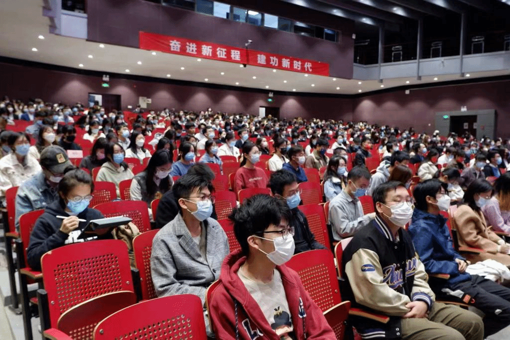 部分学生党员、团员代表在辅导员黄唯城的带领下在千人礼堂集中观看开幕会。