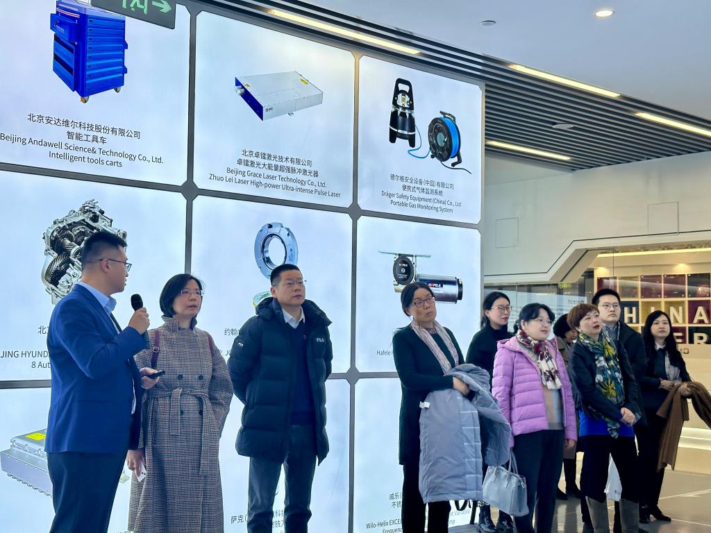 在北京中德产业园运营公司副总经理孙海龙的引导下,球王会体育官方网站教师党支部一行详细了解了产业园在搭建国家级对德合作平台、服务国家级对德合作项目、链接全国对德合作资源等方面的建设成果。北京中德产业园是国家发改委批复的国内首个以“经济技术合作”为主题的中德示范区。园区定位为“德国先进制造业的聚集地、中德隐形冠军发展的战略高地、中德交往与开放创新的重要窗口”,聚焦新能源智能汽车、智能装备、数字经济三大主导产业,和先进制造服务业支撑产业,已集聚奔驰、宝马、Ameco、博世、威乐水泵等90余家德资企业,年产值350亿元。