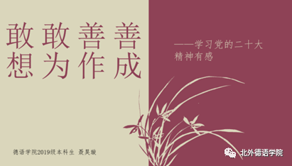 接下来,本科生党支部书记聂昊璇分享了自己的学习感悟。她认为以自己为代表的疫情一代青年大学生既生逢其时,也应肩负重任,应勇敢面对时代的“大考”,在疫情影响下找寻生活的平衡,担负起属于当代青年人的使命,在实践中考验和磨炼自己,实现自我价值。她以习近平总书记在二十大报告中对青年“怀抱梦想又脚踏实地,敢想敢为又善作善成”自勉,结合自己和同伴组队参加两次全国性德语赛事的经历,认为应从生活中的点滴小事做起,善始善终,善作善成,不忘初心,持之以恒,立志成为有理想,敢担当,能吃苦,肯奋斗的新时代好青年。