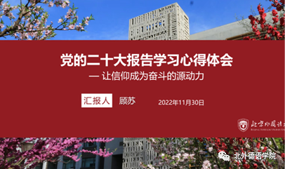 会议的第三部分,支部入党积极分子、球王会体育官方网站青年教师代表顾苏分享了学习二十大报告的心得。她认为,二十大报告系统回顾总结了新时代十年的伟大变革,科学擘画了未来中国发展的宏伟蓝图,其中突出强调了教育、科技和人才的作用。作为具有鲜明“红色基因”的北外教师,我们应不忘初心、牢记使命,为党育人,为国育才,切实将二十大精神有机融入到教学工作中;发挥自身的学科优势,为构建中国特色的学科、学术体系以及话语体系添砖加瓦,把服务国家作为科研工作的最高追求。她结合个人参与庆祝中德建交50周年《中德大咖谈》节目录制的经历,认为外语教师应力求在大格局下讲好小故事,向世界发出中国声音。