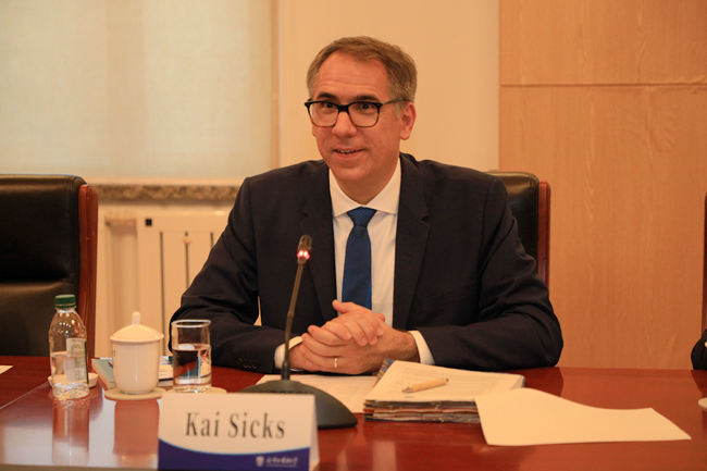 凯·西克斯赞赏北外的学科建设和人才培养取得的卓越成绩,感谢多年来北外对德国学术交流中心项目的支持。他介绍了德国学术交流中心近期的活动情况,表示愿意继续深化与北外的合作关系,共同推动中德友好交往。