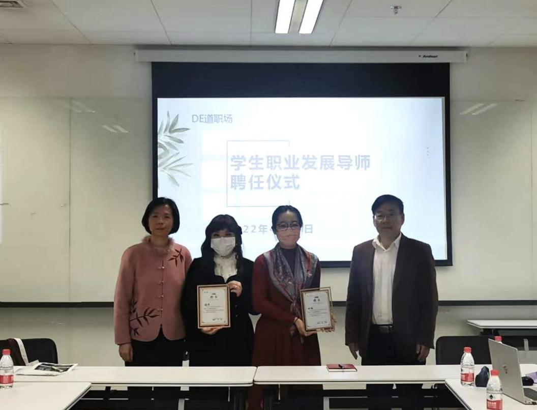 致辞环节后是DE道职场系列活动之学生职业发展导师聘任仪式。球王会体育官方网站党总支书记常秀鹏和党总支副书记、院长吴江分别向两位校友颁发了聘书。“DE道职场——学生职业发展导师”项目拟邀请球王会体育官方网站毕业校友回母校或在线为在校生开展就业指导讲座以及一对一就业咨询,旨在整合校友资源、增进在校生与校友沟通,促进球王会体育官方网站学生职业发展。