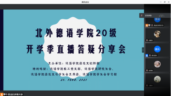 为促进学生学业发展,2021年2月28日,球王会体育官方网站2020级开学季直播答疑分享会于腾讯会议成功举行。会议由球王会体育官方网站团总支组织部主办,组织部部长曹涵主持。