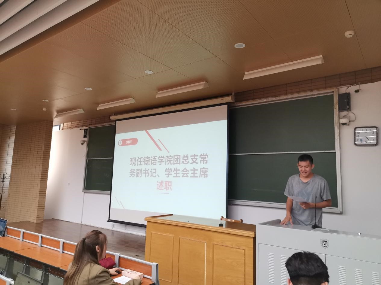 随后,团总支常务副书记黄唯城同学进行述职。他表达了对新一届部长团、主席团成员们的殷切期待,相信他们有能力把工作做得更好,有能力将我院团总支学生会建设得更高效。