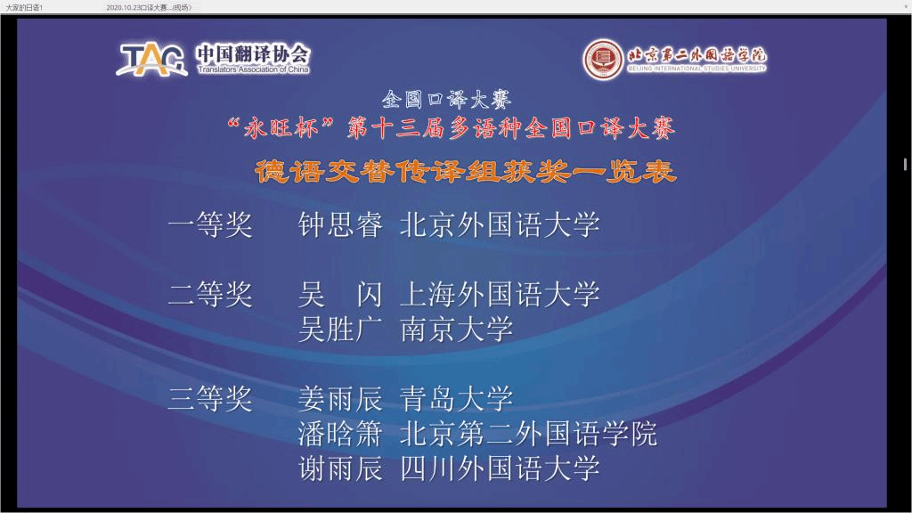 球王会体育官方网站2018级研究生钟思睿同学10月24日在 “永旺杯”第十三届多语种全国口译大赛中荣获德语交传组冠军、一等奖。