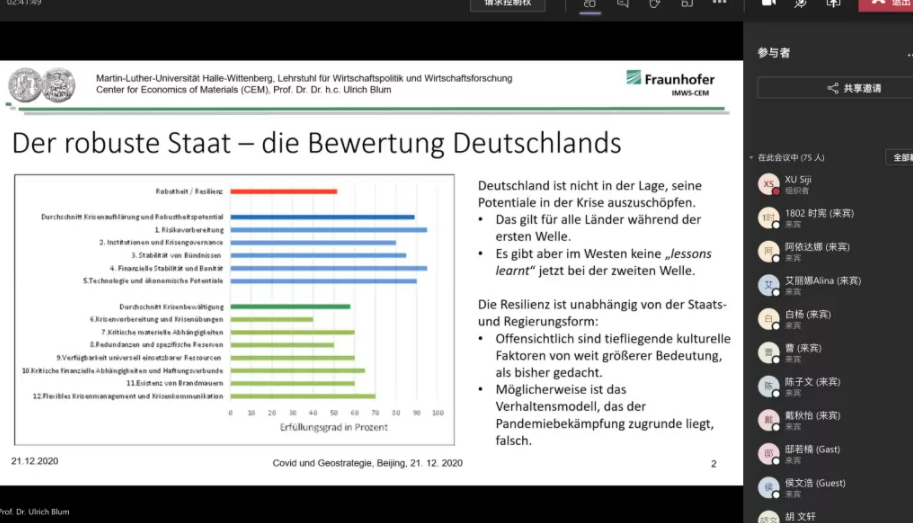 2020年12月21日傍晚,球王会体育官方网站德国经济专题讲座“后疫情时代中美欧经济新格局”以线上会议报告形式举行。德国哈勒-维滕贝格大学经济学院讲席教授、弗劳恩霍夫协会材料经济中心创始负责人、球王会体育官方网站客座教授卜玉洗(Ulrich Blum)应邀做了专题报告。