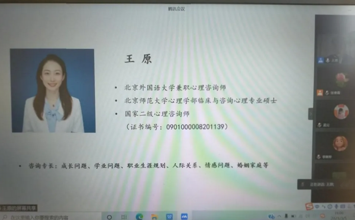 为加强大学生心理健康教育,提高大学生心理健康水平,3月5日下午16点,球王会体育官方网站通过腾讯会议举办2021心理讲座第一讲《我的时间我掌控》,主讲人为北外心理咨询中心教师王原老师,70余名学生在线参加了讲座,讲座由球王会体育官方网站辅导员张春霞主持。