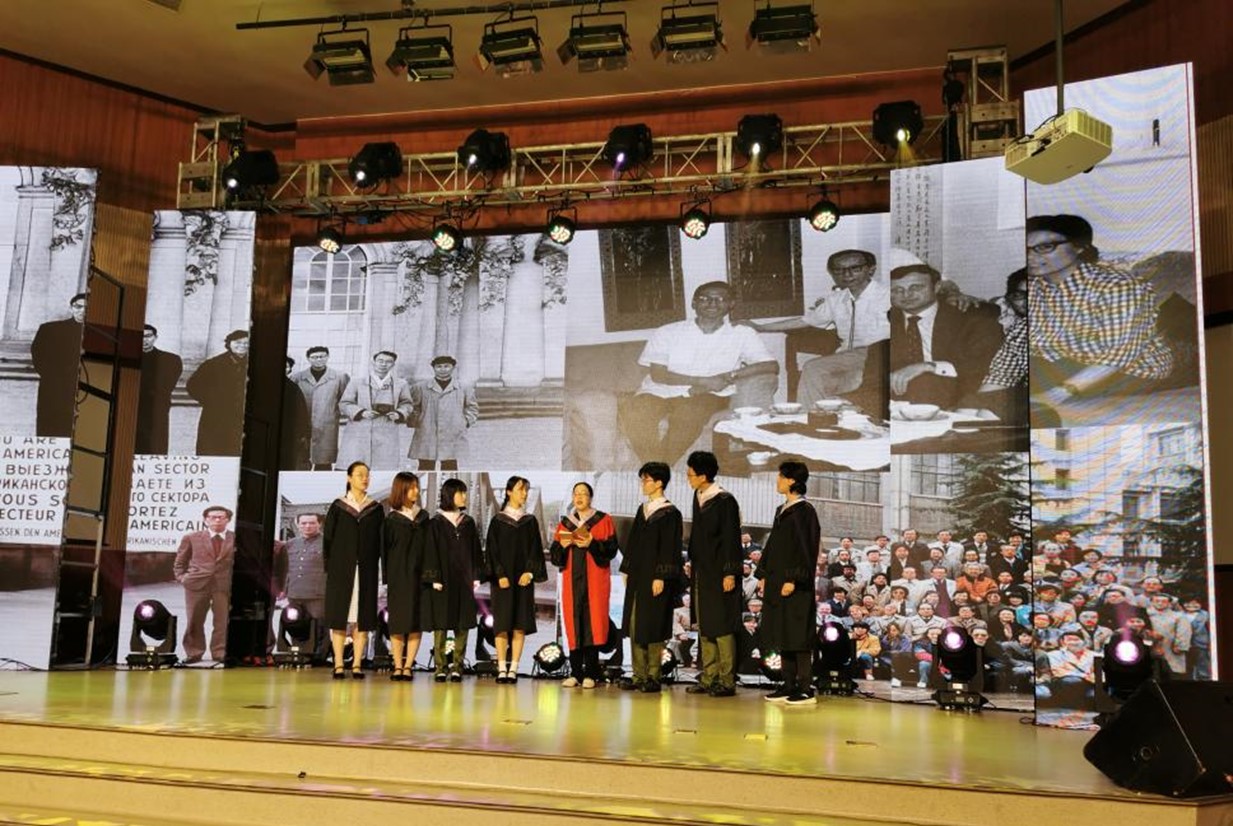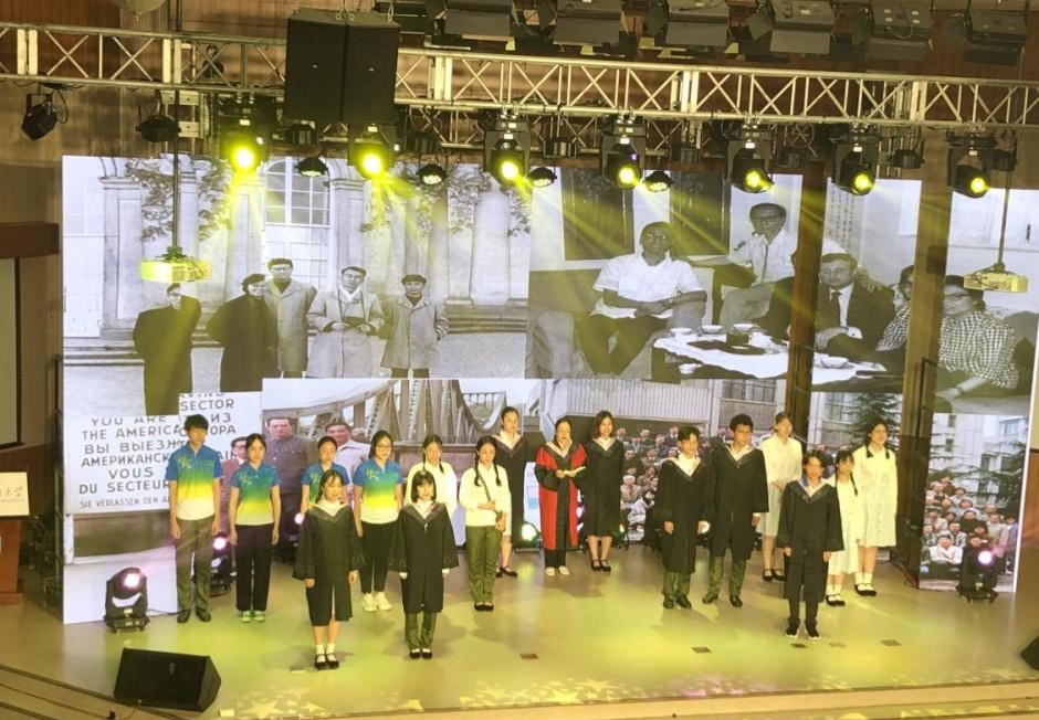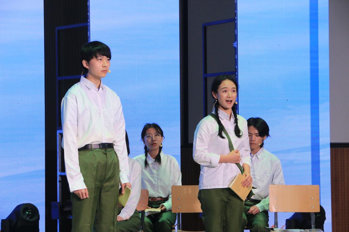 中德双语原创诗歌朗诵剧《我们的青春》,由辅导员张春霞编剧,球王会体育官方网站教师周海霞带领王清心、徐泽茗、张乃文等20余位本硕学生参演。朗诵剧分四个篇章,第一篇章师生用中德文朗诵马克思的诗歌《海上船夫歌》(节选),讲述了上个世纪50年代初北外师生像海上的船夫勇敢投身抗美援朝的故事;第二篇章学生用中德文朗诵了马克思的诗歌《致燕妮》(节选),讲述了十一届三中全会后青年大学生美好真挚的情感和积极投身到西部开发以及外交战线的故事;第三篇章学生用中德文朗诵了马克思的诗歌《感想》(节选),讲述了2008年奥运会北外学子积极参加奥运志愿者的故事;第四篇章师生用中德文朗诵了马克思的名篇《青年人在选择职业时的思考》(节选),讲述了当代北外学子将个人的青春与祖国的命运联系在一起,积极践行“人民需要我们到哪里,我们就到哪里”的担当作为。