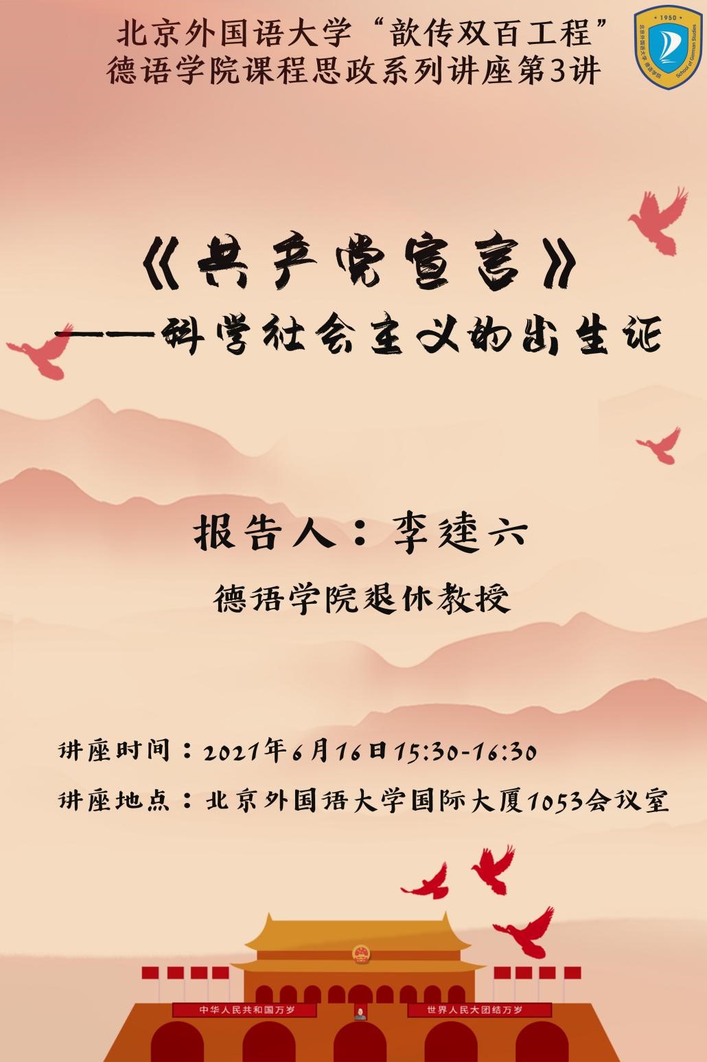 为迎接中国共产党百年华诞,深入学习党史,推进我校党委启动的“歆传双百工程”,球王会体育官方网站党总支和北外离退休党总支第十九党支部联合邀请到了我院德高望重的退休教师李逵六教授举办了题为“《共产党宣言》:科学社会主义的出生证”的专题报告会。此次专题报告会也是球王会体育官方网站课程思政系列讲座之一。
