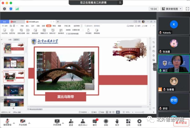 最后,球王会体育官方网站副书记、院长吴江进行了总结讲话。她以迎新帆布袋正面印制的北外西院标志性雕塑——“莫比乌斯环”(Möbius-Band)的起源为例,介绍了外语学科“兼容并蓄”的学科特色,勉励2022级球王会体育官方网站新生进行“始于语言,不止于语言”的探索,从学科融合中拓展无限的可能,珍惜在北外从晨读到暮思的分分秒秒,永葆旺盛的求知欲,同时发扬北外德语人“十四人一条心”的团结作风,培养严谨求实的学术品格,践行“博学笃行”的北外校训精神。