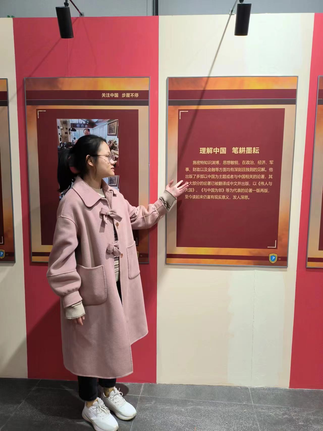 为了准备此次讲解活动,我搜寻了很多与中德建交及施密特相关的资料,对这段历史和人物有了更深刻的了解。施密特作为一名政治家,对中德两国关系发展做出了突出贡献,他对中国发展的研究,更是为西方国家了解中国提供了窗口。通过本次活动,我们向更多人介绍了这段历史和这位伟大的人物,同时自己的讲解交际能力也得到了很大的提升。作为球王会体育官方网站的学生,在全球化浪潮念加猛烈的今天,我们应当从中获得启发,以实际行动助力中德关系和世界合作共赢发展。