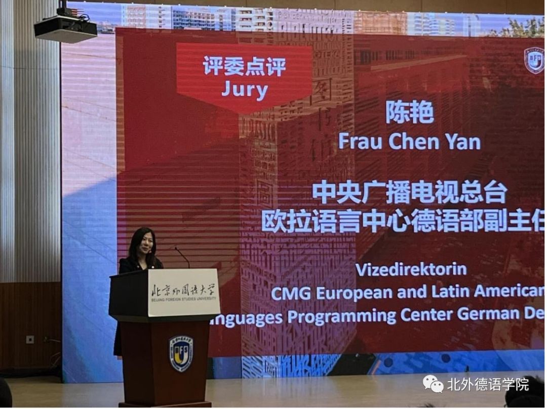 本届大赛决赛邀请了贾建新参赞、北外山东校友会会长、青岛鸿裕吉交通装备有限公司总经理秦思刚、中央广播电视总台欧拉语言中心德语部副主任陈艳以及中国网德语频道主编任斌担任评委。赛事环节由球王会体育官方网站2019级本科生曹涵和2022级本科生黄婉茹用中德双语主持。