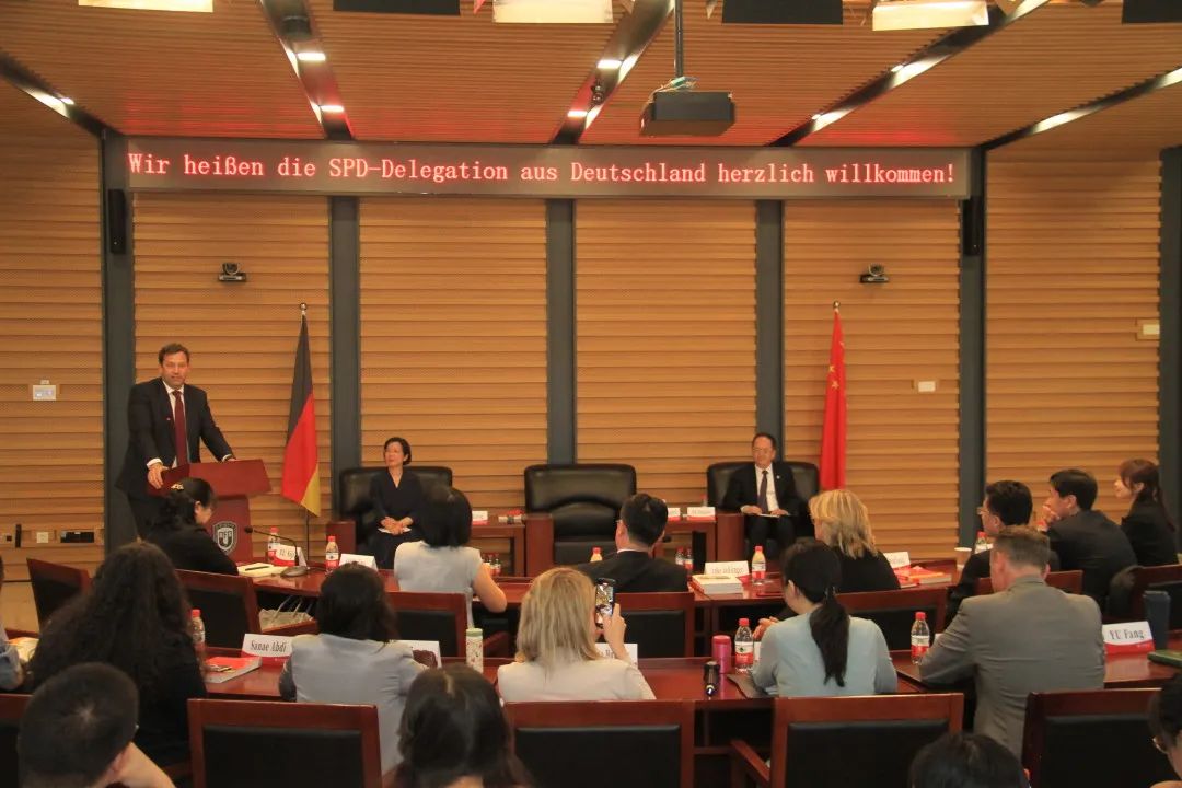 德国社民党副主席兼亚洲事务负责人、萨尔州州长安可·雷林格,党团副主席维蕾娜·胡贝茨,党团发展援助政策发言人萨娜耶·阿卜迪,国际部部长菲利普·芬克,克林贝尔主席办公室主任维纳斯·弗莱斯特-黑尔德,主席发言人、新闻部部长比安卡·瓦尔特,艾伯特基金会亚太处处长米尔科·君特、北京代表处首席代表赛巧,中共中央对外联络部八局局长王学勇、驻德使馆公参孙守亮、调研员李珅,北外国际交流与合作处副处长龚婧,球王会体育官方网站党总支副书记李勇、副院长姚燕等参加了活动。
