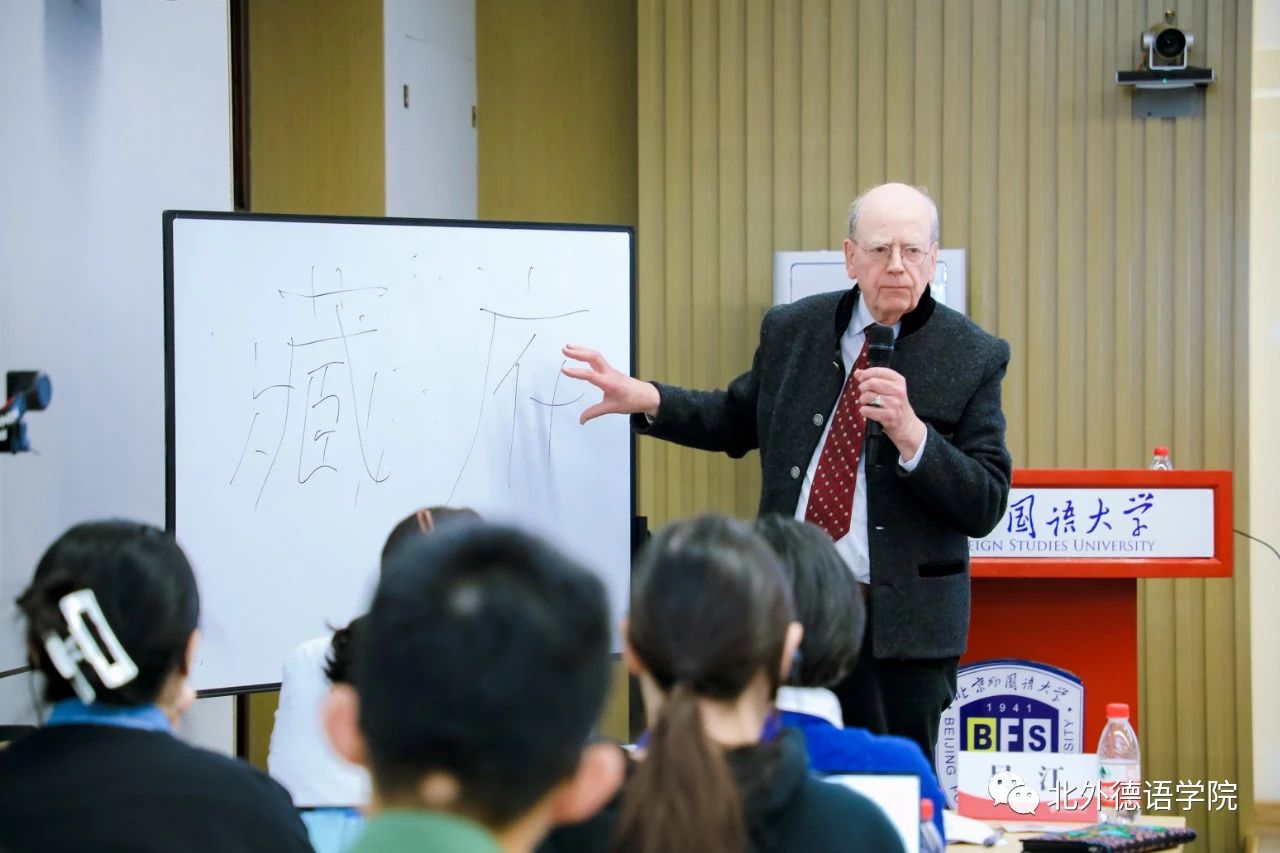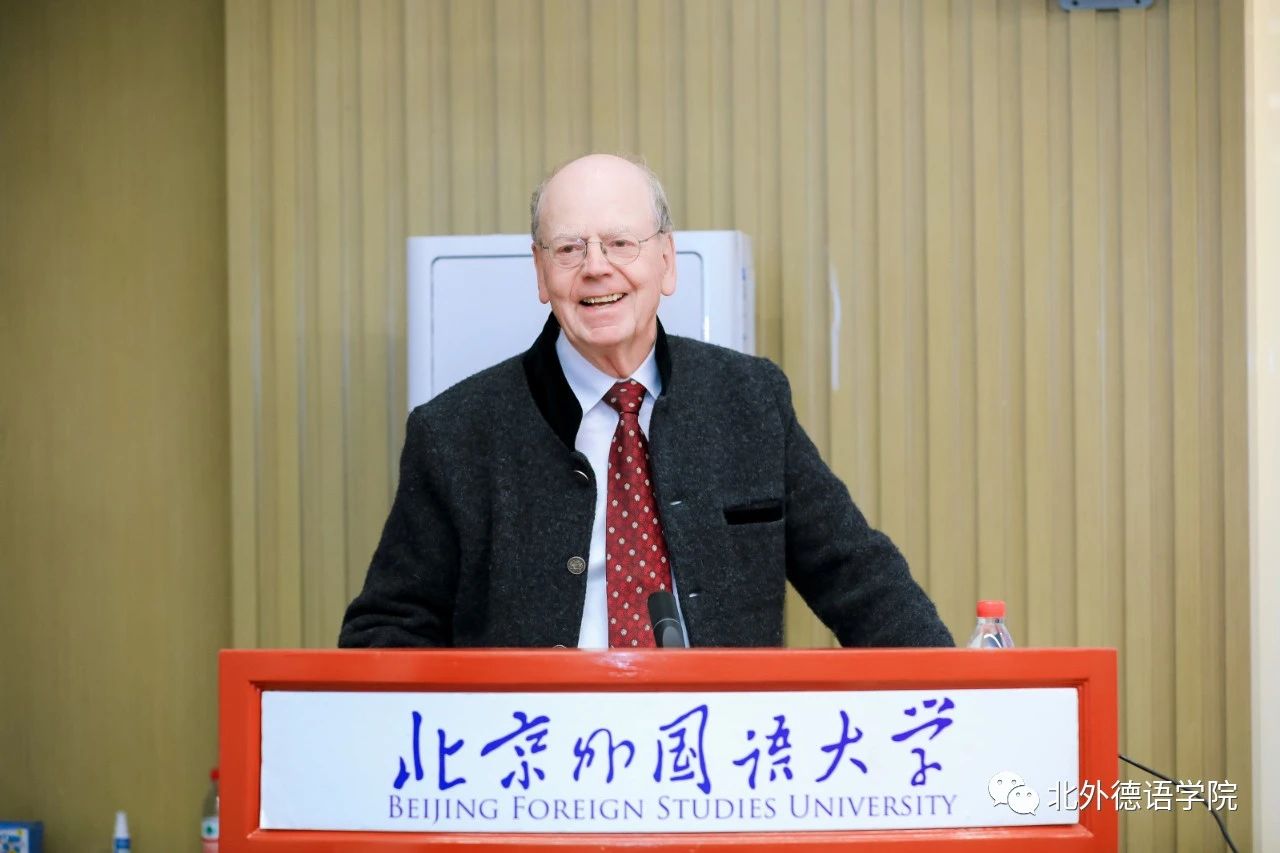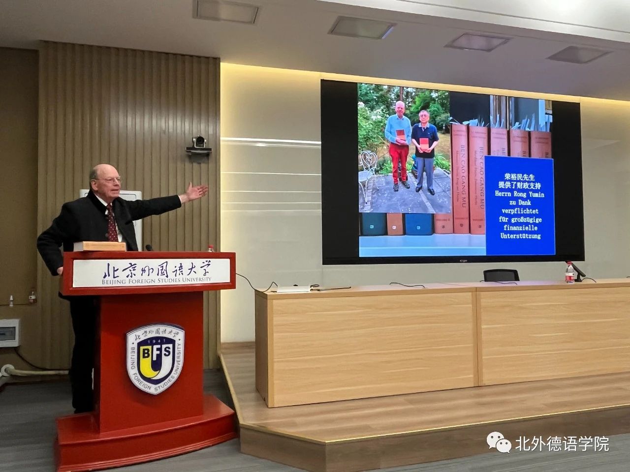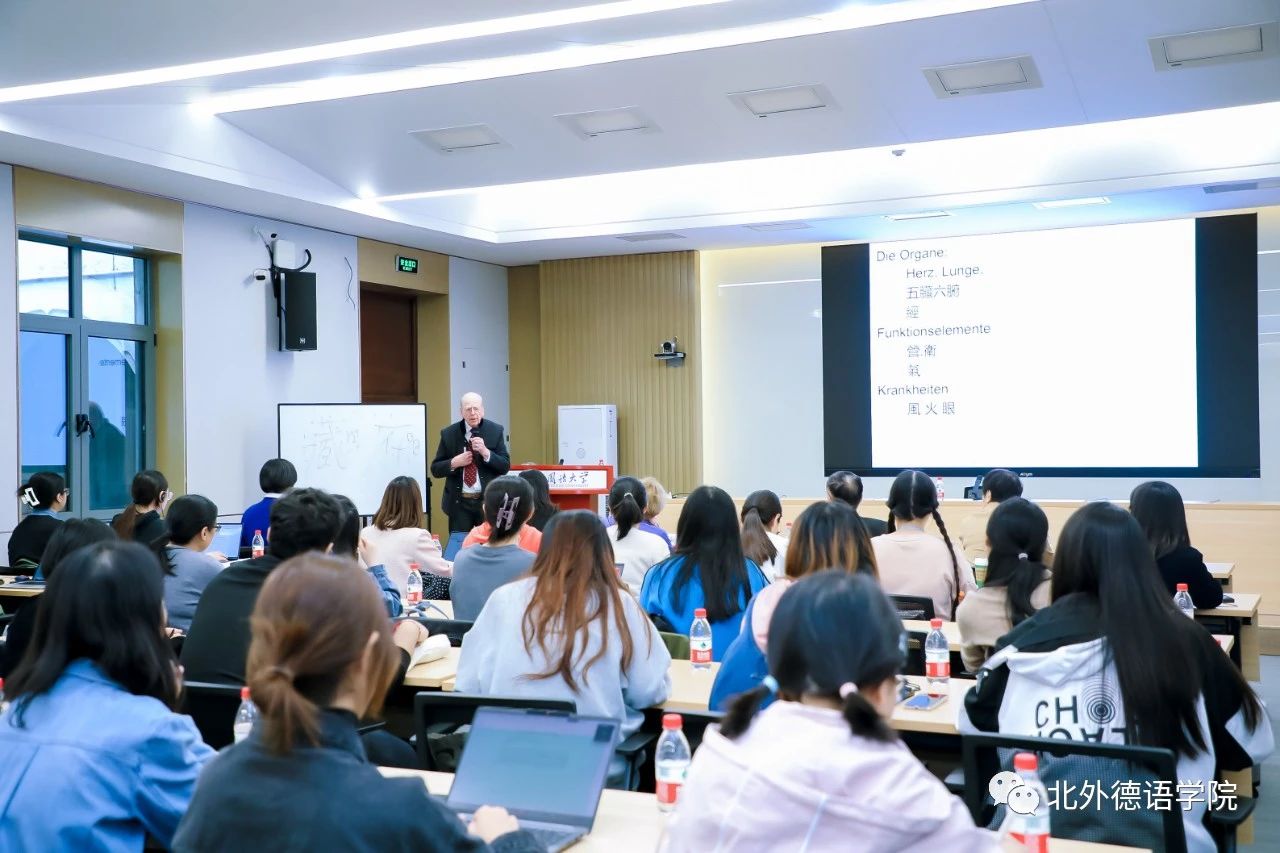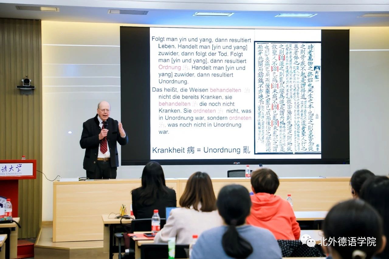 2023年10月18日下午,北外德语国家讲堂系列报告“中医古籍翻译的体会与心得——以《本草纲目》的翻译为例”在球王会体育官方网站东院晨读厅成功举办。报告主讲人为德国著名医史学家、翻译家文树德教授(Prof. Dr. Paul U. Unschuld),专攻中、欧医学及生命科学比较史,尤擅长医学思想史、伦理史研究。文树德教授夫人文淑德女士(Ulrike Unschuld)、球王会体育官方网站1977级校友、德国Rolux Leuchten GmbH 公司创始人、中国赛尔富电子有限公司董事荣裕民先生,球王会体育官方网站党政联席会成员、教师代表及近百名学生聆听讲座。讲座由球王会体育官方网站党总支书记、院长吴江主持。