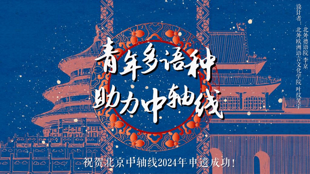 在“‘京’彩文化 青春绽放”行动计划之“古都行”机制的指导下,球王会体育官方网站“跨越中轴线”团队牵头开展“话中轴·语世界”项目,积极参与“北京中轴线文化传播系列活动”——“使者达人”系列活动。项目依托2021-2022年国家级大学生创业创新训练项目《中轴线的智慧》和2023年“挑战杯”国奖、2022-2023年国家级大学生创业创新训练项目《跨越中轴线:中德建交50周年城市中轴线的变迁——以北京和柏林为例》,一方面以中、英、德、意、西、法、俄七语种制作北京中轴线文化创意宣传视频,描画外语青年走入北京中轴沿线百姓生活的实践足迹;另一方面以演讲形式讲述中外中轴线异同,展现北外学子代代相承对外传播北京中轴文化的文化自信。