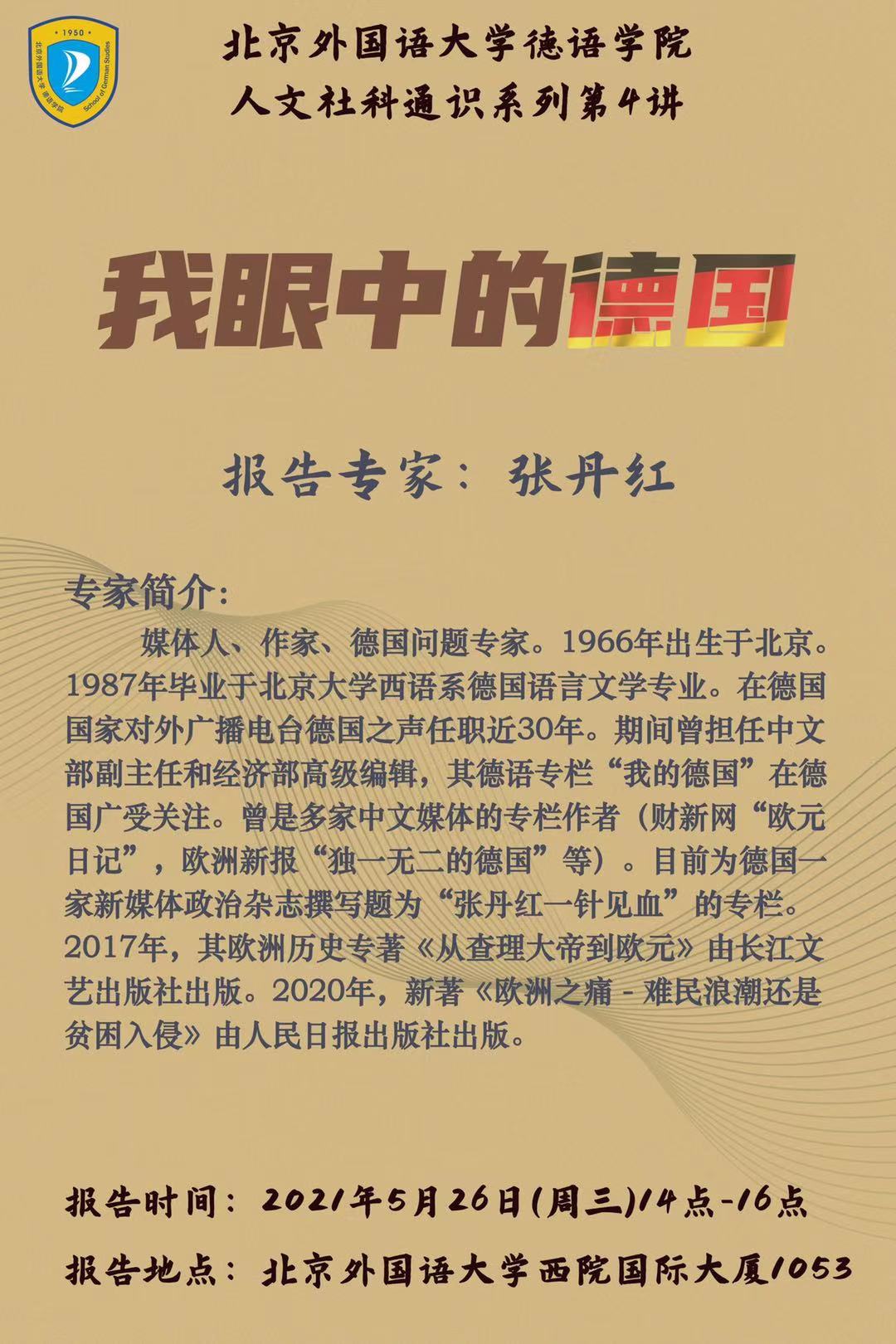 2021年5月26日下午,球王会体育官方网站人文社科通识系列讲座第4讲在北外西院国际大厦1053会议室举行。资深媒体人张丹红女士应邀作了题为“我眼中的德国”的讲座。讲座由球王会体育官方网站院长吴江主持。
