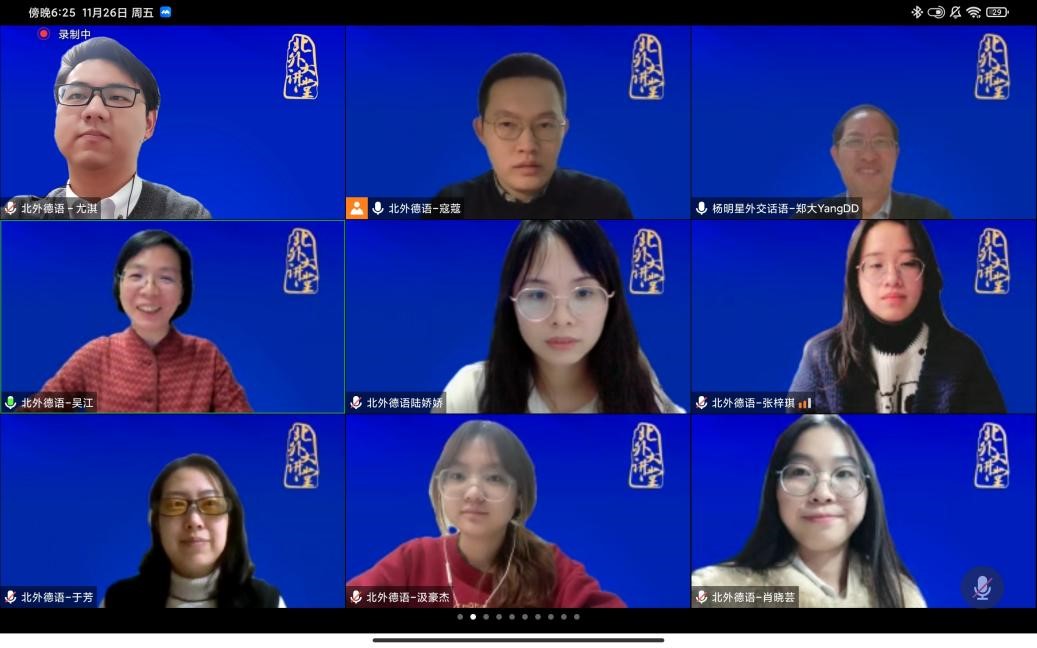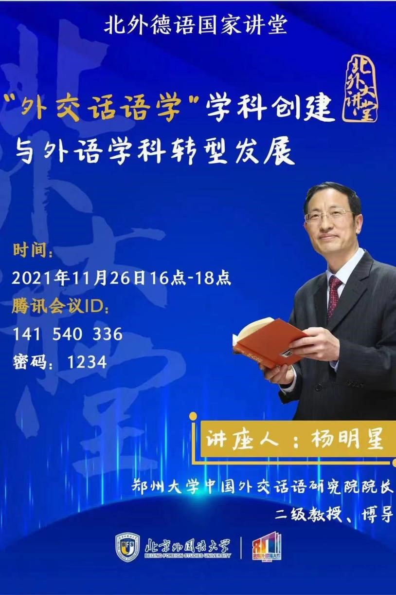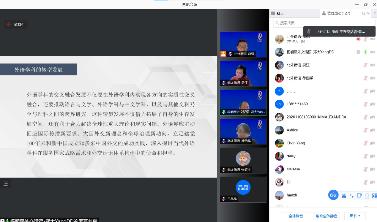 2021年11月26日下午,北外德语国家讲堂以线上方式举行。郑州大学中国外交话语研究院院长杨明星教授应邀作了题为“‘外交话语学’学科创建与外语学科转型发展”的讲座。讲座由球王会体育官方网站党总支副书记、院长吴江教授主持。来自全国各高校的120余位师生参加了讲座。