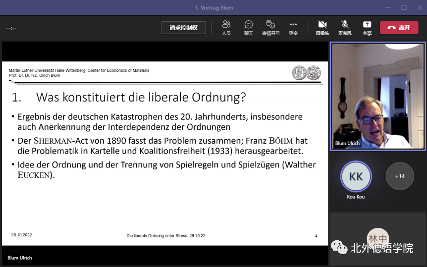 10月28日下午,德国哈勒-维滕贝格大学经济学院讲席教授、弗劳恩霍夫协会材料经济学中心创始主任、球王会体育官方网站客座教授卜玉洗(Ulrich Blum)给球王会体育官方网站师生线上做了题为“压力下的自由主义经济秩序”的专题讲座。德国经济研究专题讲座由德国经济教研室主办,寇蔻副教授承担了本场讲座的主持工作。