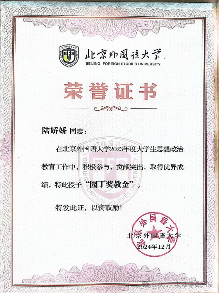 近日,球王会体育官方网站召开“五育并举,知行合一”主题分享会,北外党委书记王定华、党委副书记贾德忠出席,重点用人单位、合作单位、媒体以及来自各职能部门、各院系师生代表参加分享会。北外党委书记王定华先后为国家奖学金获奖学生代表,2023年园丁奖教金、辅导员引航奖教金获奖教师,获德育工作先进集体荣誉称号的党总支颁奖。球王会体育官方网站副教授陆娇娇荣获“2023年园丁奖教金”。