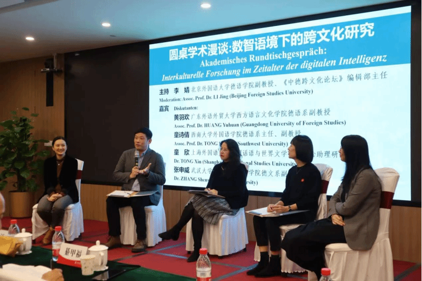 分论坛结束后,圆桌学术漫谈环节在北外球王会体育官方网站副教授、《中德跨文化论坛》编辑部主任李婧的主持下进行。本次漫谈以“数智语境下的跨文化研究”为主题,邀请广东外语外贸大学西方语言文化学院德语系副教授黄羽欢,西南大学外国语学院德语系主任、副教授童诗倩,上海外国语大学中国话语与世界文学研究中心助理研究员童欣,武汉大学外国语言文学学院德文系副主任、讲师张申威,依次从经验性和展望性的角度探讨人工智能对跨文化交流研究的影响以及研究范式革新等话题讲述了个人心得,共同展望了数智时代跨文化研究的跨学科机遇与创新发展方向。