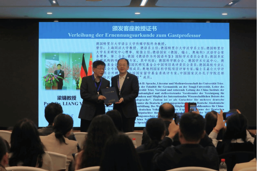 随后举行客座教授聘任仪式。德国特里尔大学语言文学传媒学院终身教授,原特里尔大学汉学系主任、德语国家汉语学会第二会长、同济大学教授梁镛受聘担任球王会体育官方网站客座教授,贾文键校长为其颁发客座教授聘书。