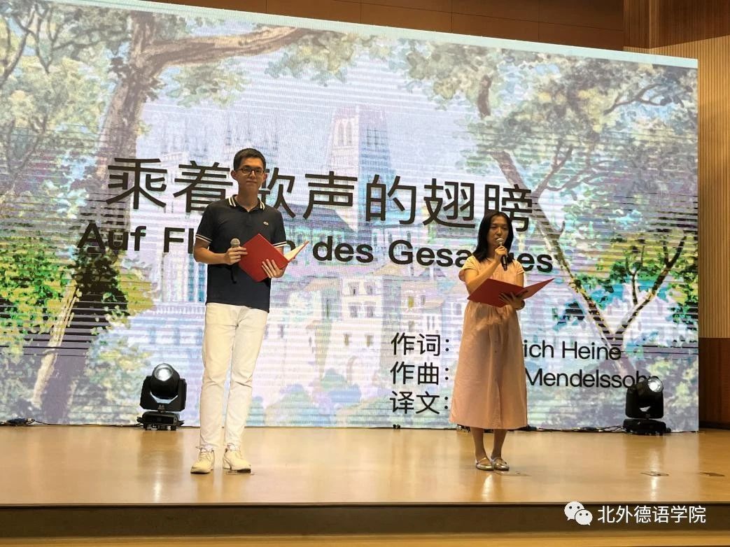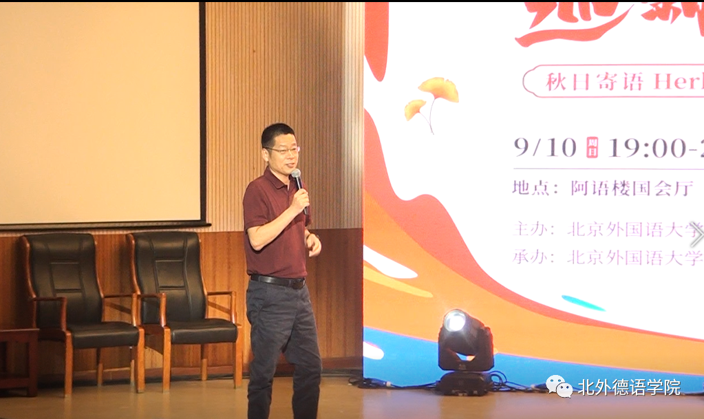 球王会体育官方网站党总支委员、副院长张晓玲、寇蔻,青年教师武迪,22级硕士生姜浩远四人联袂表演中德文诗歌朗诵《秋日诗语》,朗诵了德国经典诗歌里尔克《秋日》、席勒《希望》和马克思经典著作《青年在选择职业时的考虑》(节选),使新生们感受到了德文之美、中文之妙,经典著作的隽永留香。
