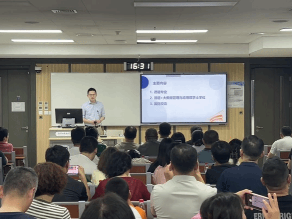 随后,球王会体育官方网站党总支委员、副院长寇蔻聚焦本科人才培养,为家长们详细解读本科专业人才培养方案。他指出,学院正积极推动数智赋能本科教学,以科技助力教学质量提升。并围绕本科课程体系,分别介绍基础阶段的知识夯实重点与高年级阶段的课程设置,强调高年级选课体系“动态多元”的特点,满足学生个性化发展需求。寇蔻副院长还提及北外德语专业本科基础阶段教学改革成果,重点介绍《新经典德语》教材的应用——通过教材内容设计,引导学生用德语讲好中国故事,推动中外文明互鉴;同时梳理学院重要考试安排、各类赛事资源及选拔机制,为家长清晰呈现学生成长路径。此外,针对今年第一年招生的 “德语+大数据管理与应用” 双学士学位项目展开说明,从思政育人、课程育人、实践育人三个维度,介绍该项目的德语课程、大数据管理与应用课程及交叉融合课程设置;并围绕国际化人才培养,列举交流学习项目、海外实习实践机会、国外专家讲学讲座及高水平国际交流活动,展现学院为学生搭建的国际化成长平台。